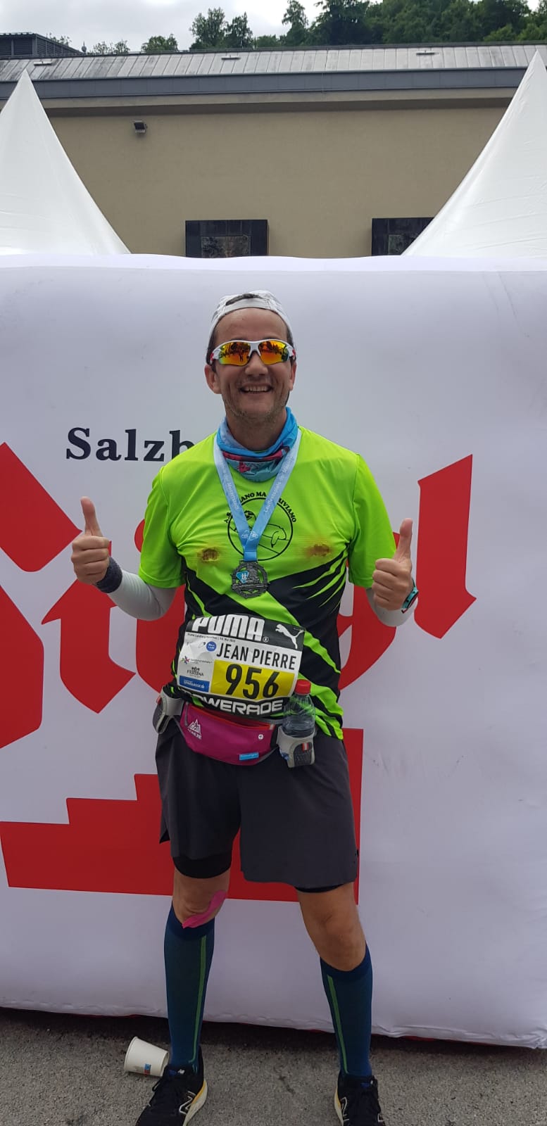 Jean Pierre Plebani alla Maratona di Salisburgo trova il diluvio universale dal 7° al 19°km, finisce la gara molto provato ma con medaglia.