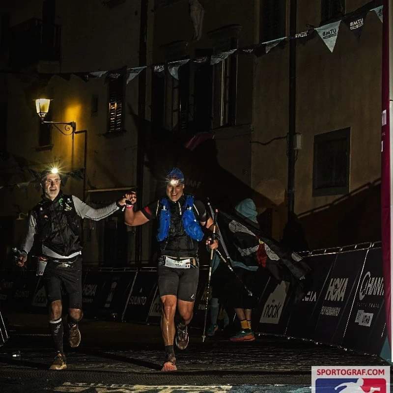 "..L’emozione di trovarmi allo start di ultra trail da 100 k è esattamente pari alla delusione di essere stata costretta al ritiro al 68 esimo km dopo 2500 metri di dislivello e 11 ore di gara! Tante lacrime e tanto dispiacere per il sogno in parte infranto, è sempre difficile pronunciare le parole mi ritiro, ma saggiamente ha deciso di non affrontare la parte più difficile del percorso". In gare così lunghe possono sopraggiungere problematiche fisiche, bisogna accettare la realtà ed essere responsabili. L'appuntamento è solo rimandato per Vanessa, che se è riuscita a fare 68 km con "una gamba" ne potrà fare 103 con tutte e due. Arrivata alla base si è presa una bella birra in attesa di Alessandro che invece la gara l'ha conclusa egregiamente tra salite e discese rocciose, fango e Ruscelli da attraversare fino all'ultimo ristoro. Da li ancora 15km lo separano dall'arrivo, sono prevalentemente in discesa ma con alcuni tratti di salita che dopo 90 km segano le gambe. La voglia di arrivare è tanta, si accelera il ritmo, fin lì tenuto basso perché per Ale questa gara è un bel lungo in vista della Tuscany crossing 160 km.