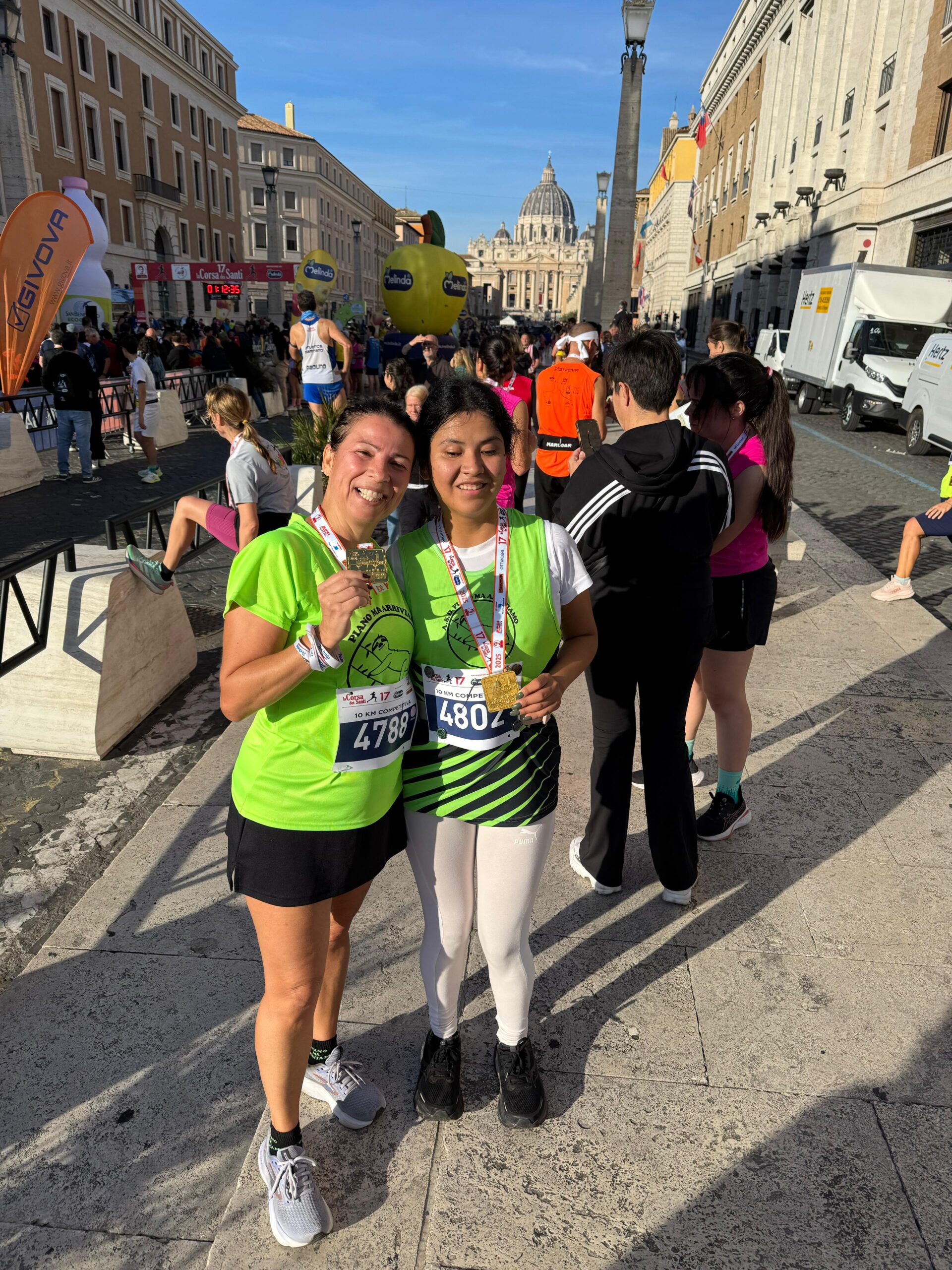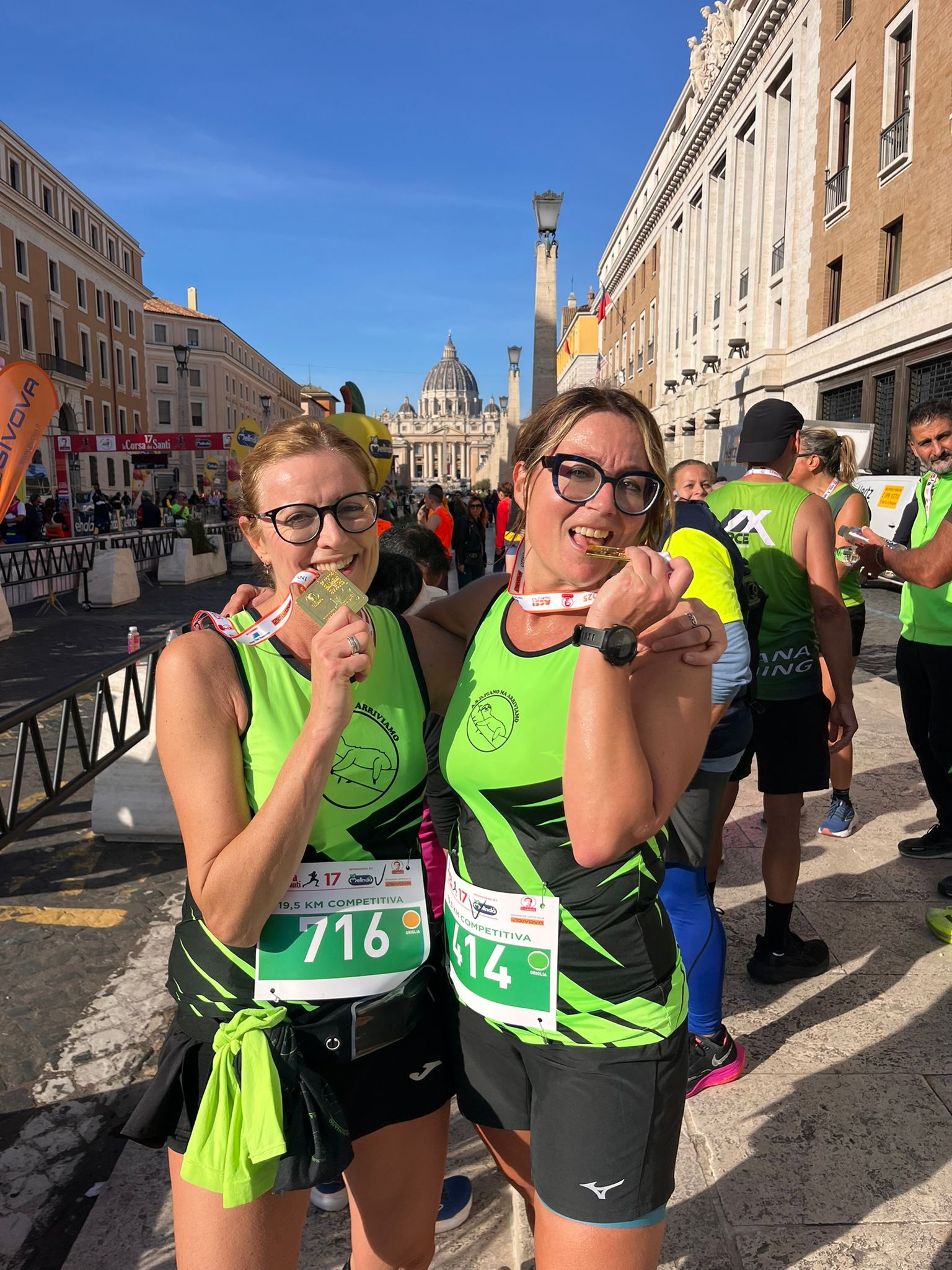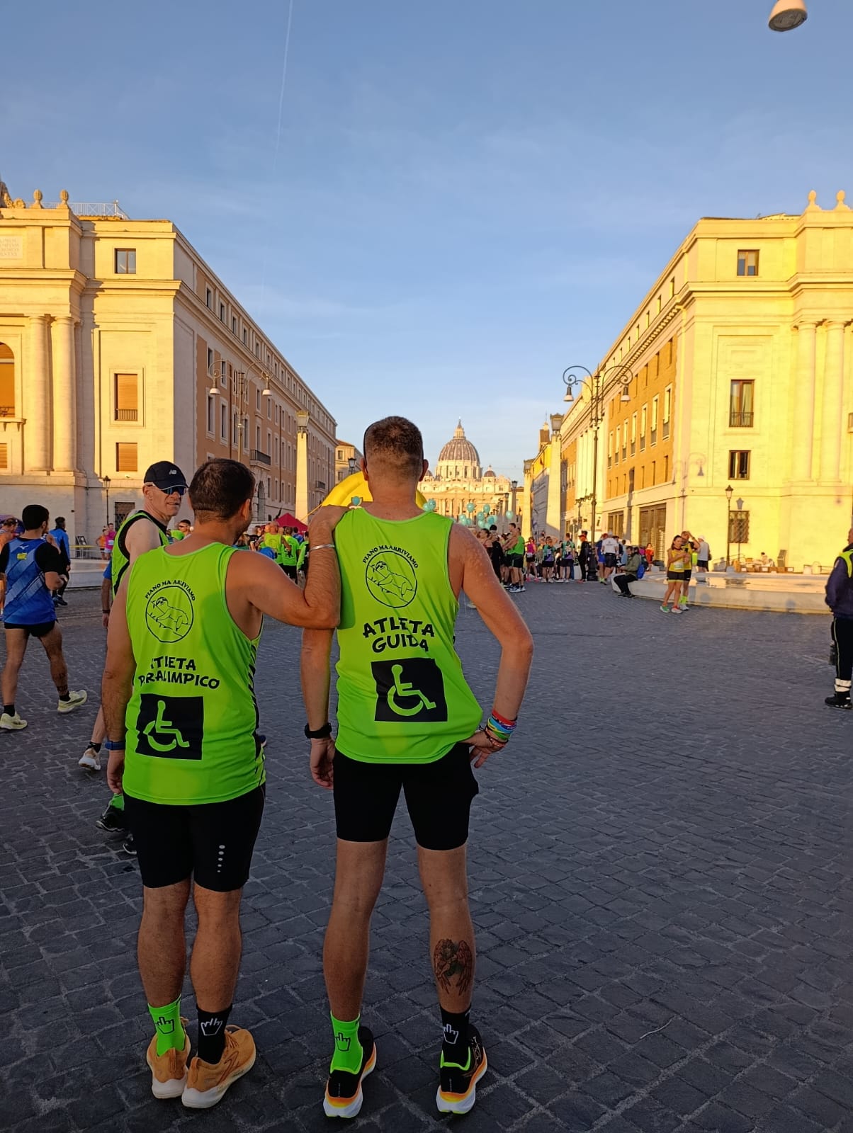 1 Novembre si parte prestissimo per La Corsa dei Santi, che quest'anno Giubilare rende possibile anche la partecipazione alla 19.5km. Il Papa attende i pellegrini e per le 10,30 deve essere tutto finito. Il solito caos alla partenza, quest'anno spostata verso Piazza Pia, e i 1650 runner iniziano il loro viaggio al centro di Roma. La lunga tocca le 4 Basiliche, molto suggestivo specialmente per gli stranieri presenti, la corta fa il solito giro che costeggia il colosseo e altri monumenti impotranti. I Bradipi sono numerosissimi, con i Pacer e i ragazzi Fispes raggiungiamo quota 190. Come sempre c'è tanta solidarietà verso i compagni di squadra. Quando passano i ragazzi con le guide tanto incitamento per loro perchè sono bravissimi. Ma tra compagni di squadra ci si aiuta a prescindere.