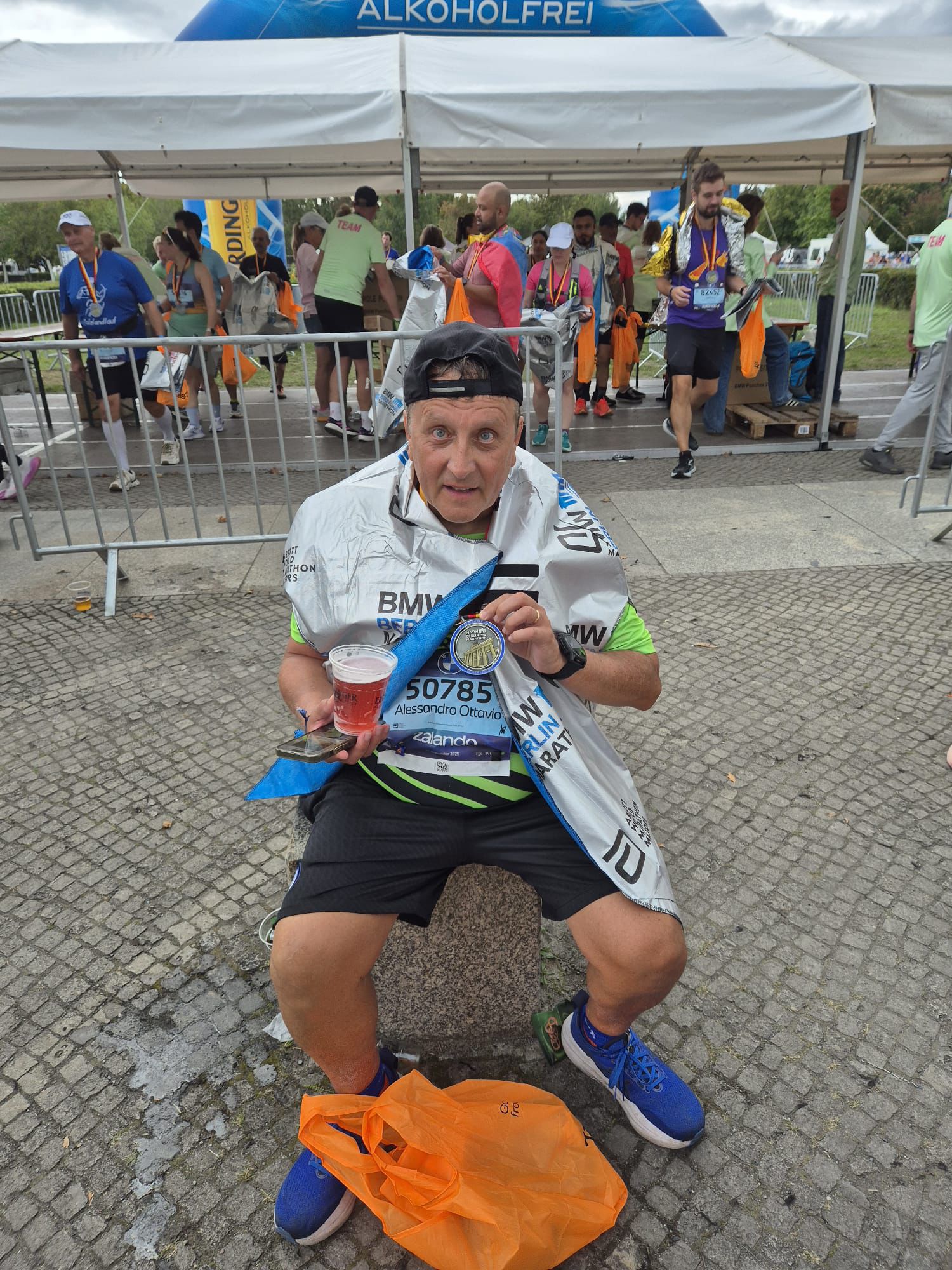 Ieri si correva anche la Berlin Marathon, alla quale partecipa un emozionato Alessandro Ambrosioni, del quale non riusciamo ad avere notizie per parecchio tempo, ma poi ci manda foto con medaglia e sorriso, una gara dura per lui ma portata a termine. Bene per Domenico De Luca che in uniforme "da guerra" conquista la sua seconda maratona e fa PB.